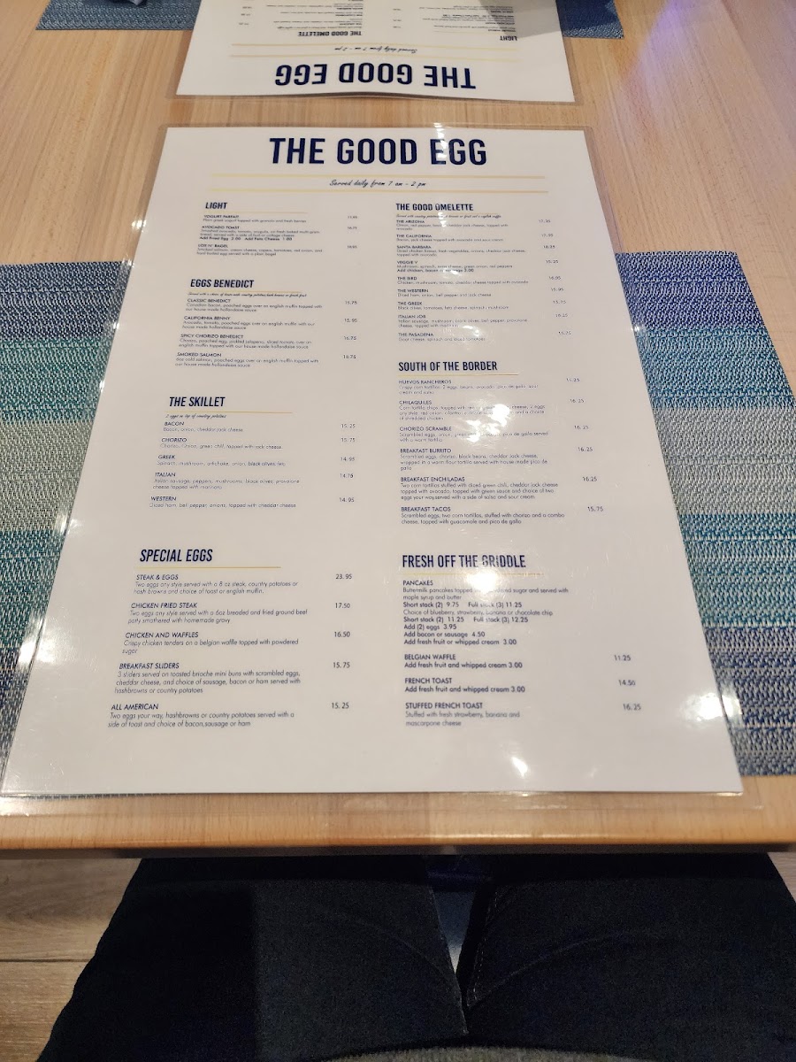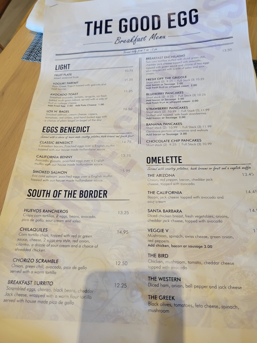 Introducing the menu at The Good Egg, located in sunny San Diego, is a delightful experience for breakfast and brunch enthusiasts. With a clean and inviting atmosphere, the restaurant ensures that every meal feels like a treat. The menu features a range of flavorful options, from hearty classic breakfasts to inventive dishes like the Arizona Omelette, allowing patrons to enjoy generous portions that satisfy.